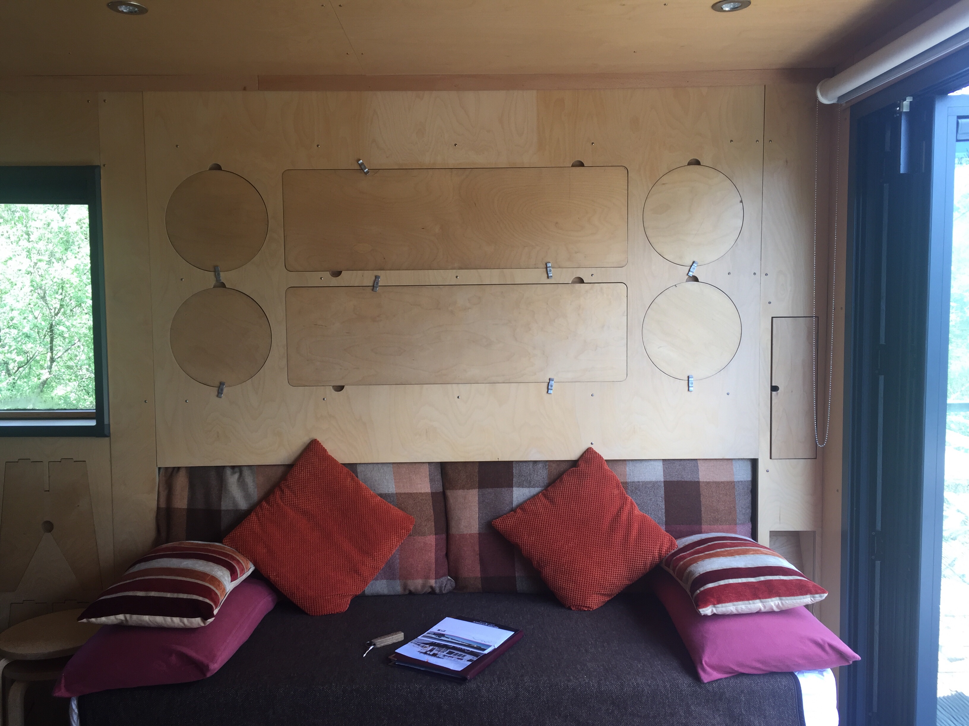 Consisting of three basic elements, a square, a triangle, and a circle, in the sky Den very distinct and unique spaces have been created. The tiny living space has flat-pack seats and pull down tables and beds built into the walls allowing the user to reconfigure the space to the accommodate the activities required.